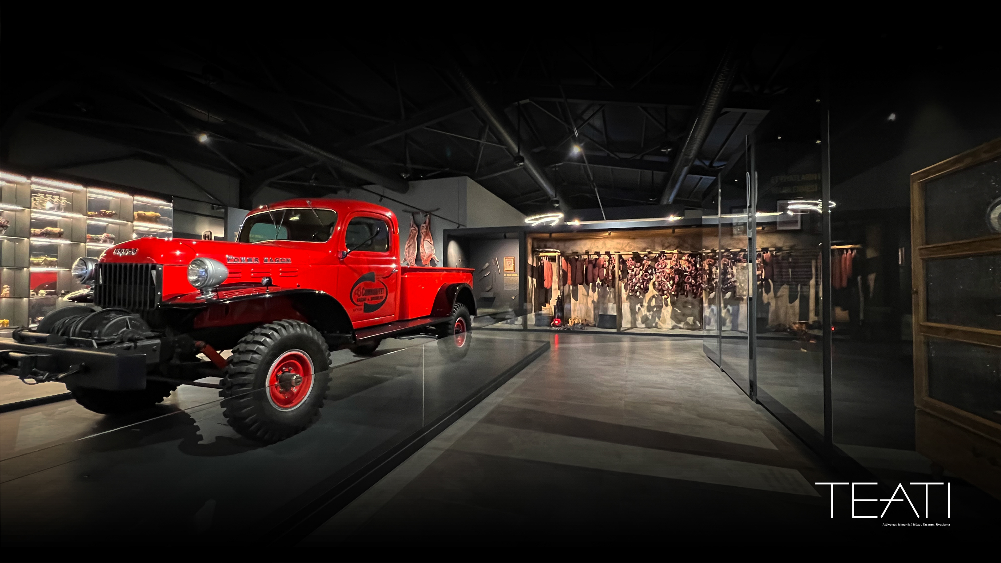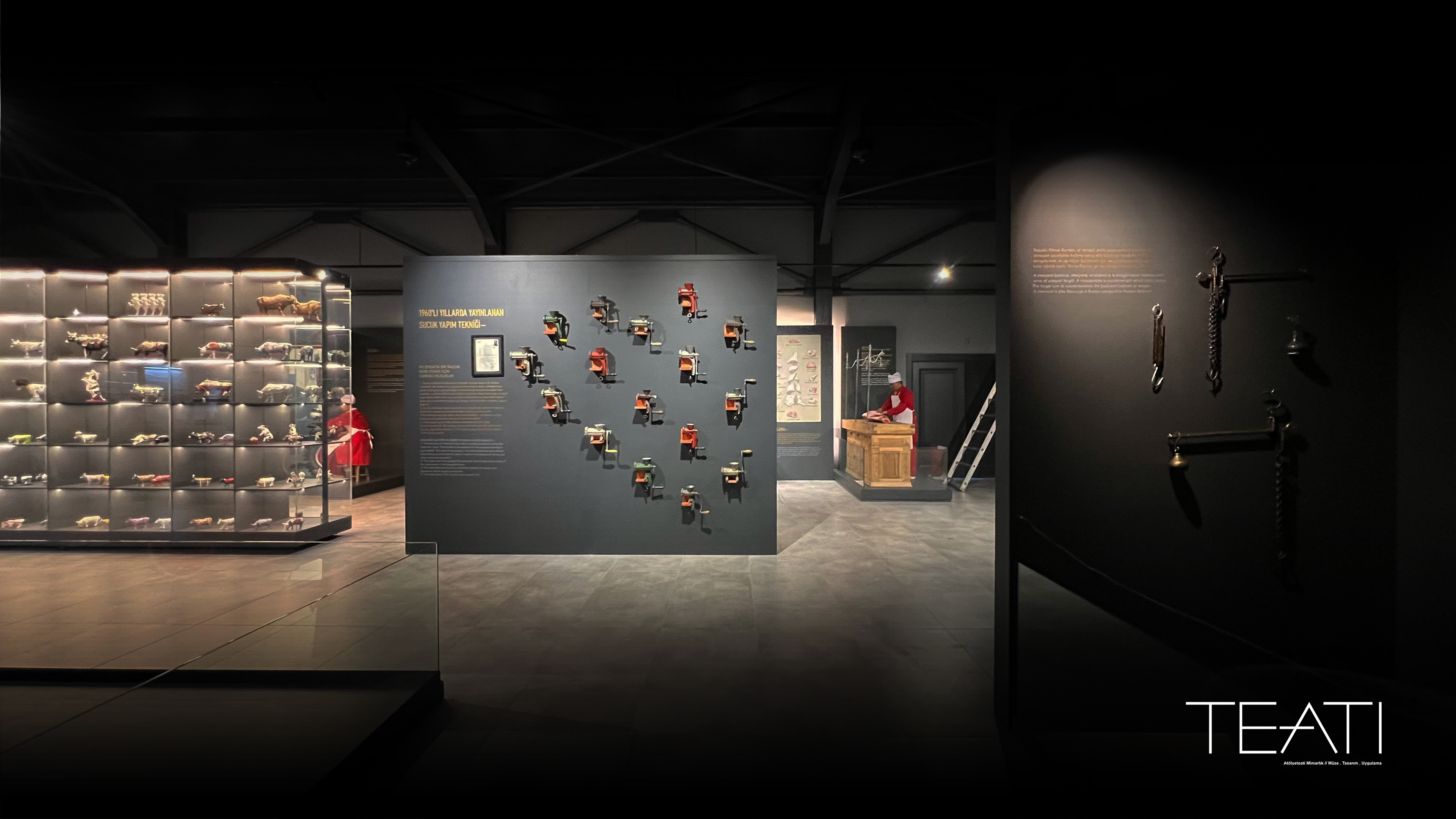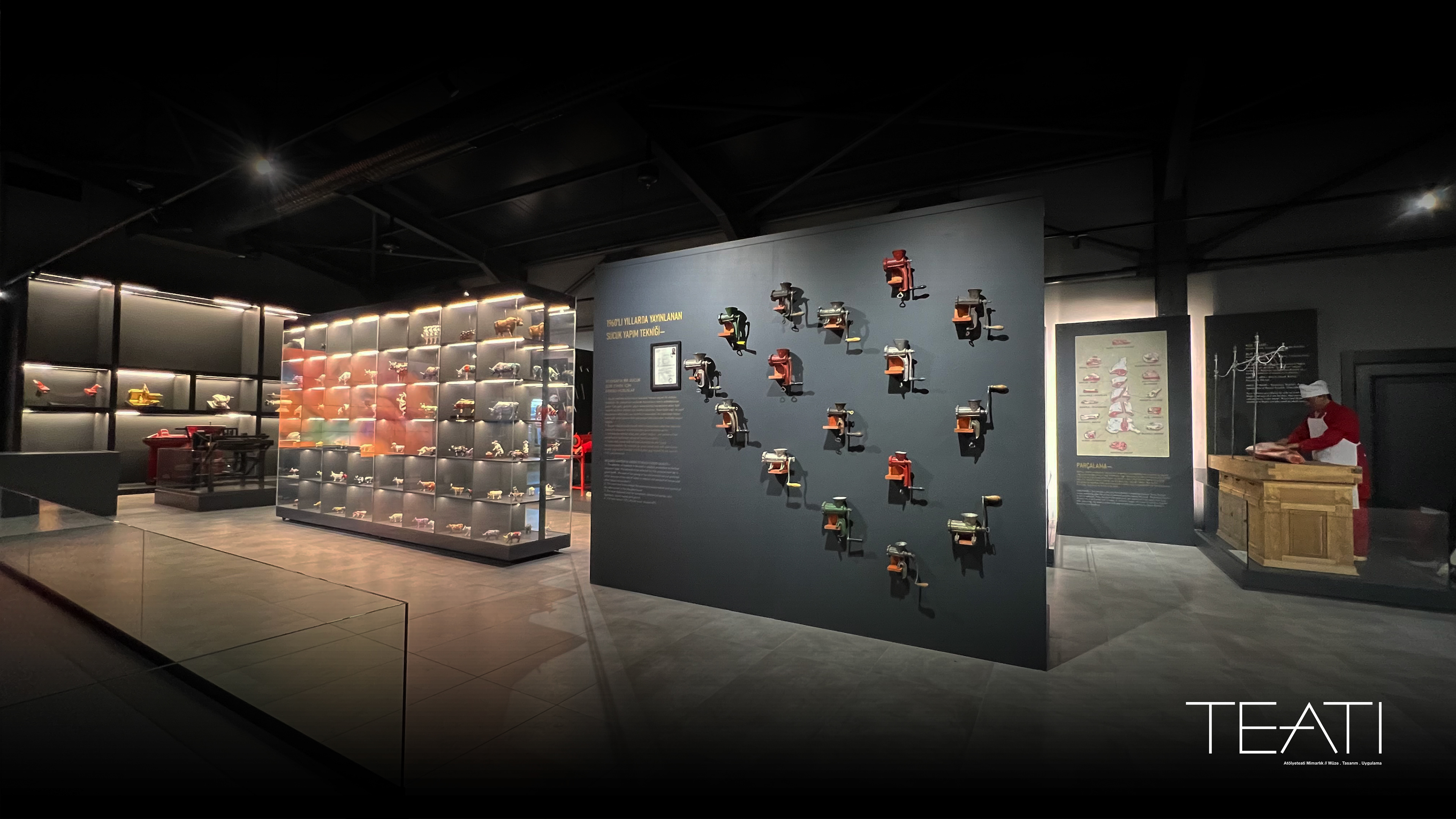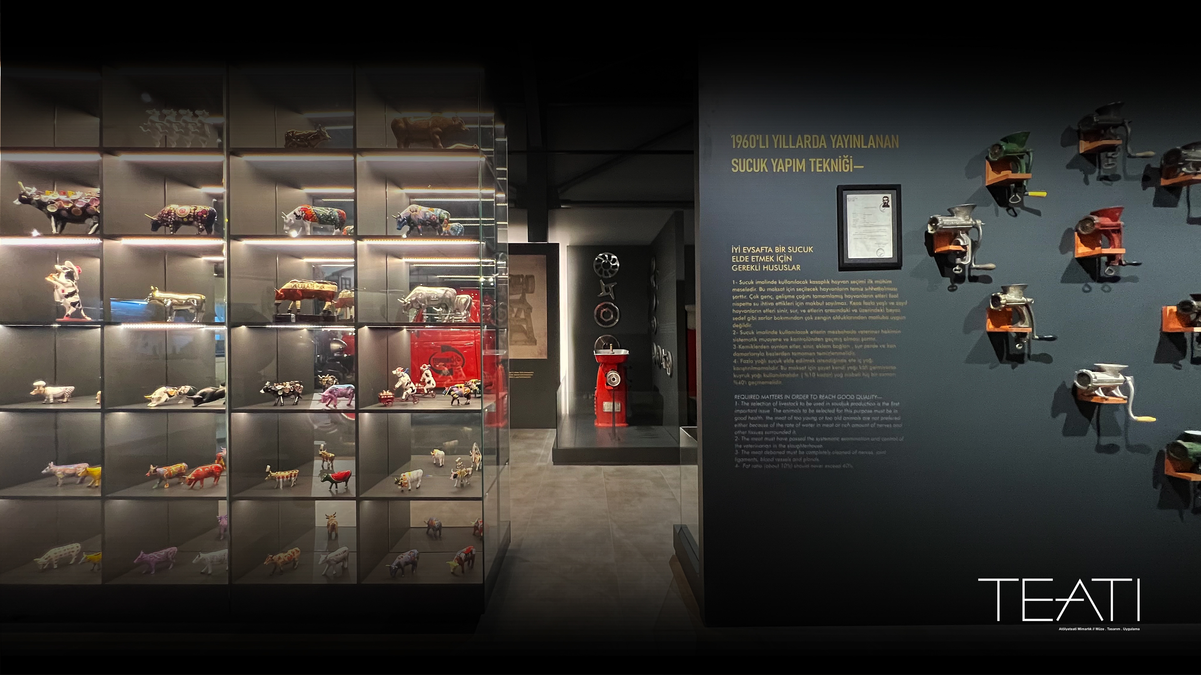 Sucuk: A Taste, A Profession and An Industry. The techniques of meat preservation have held a significant place in Turkish culinary culture for centuries. The word "sucuk," first written in Crimean Turkish in the 1300s in the book "Codex Comanicus," along with traditions of pastırma (cured meat) and kavurma (roasted meat) brought from Central Asia to Anatolia, has become a part of our palatal delight. Through professionally conducted studies, the Museum of Butchery at Afyonkarahisar approaches its thematic specialization with a broad perspective, covering Breeding, Butchering, and Culinary Culture. TEATI was responsible of the museum design from its first initiation to its official launch. The museum showcases collections and documents that bear witness to the industrialization. Designed by TEATI, the project draw out the history of Anatolian butchery and sucuk industry. The conception not only represents the story of a unique flavor of a culinary culture, but also the industurilization of a profession from local butcher shops and modernization of a city: Afyonkarahisar. Throughout the project, our designers were involved, from the initial idea of creating a museum dedicated to 'sucuk' to questioning the content of the collection and the museum's communication strategies with visitors.