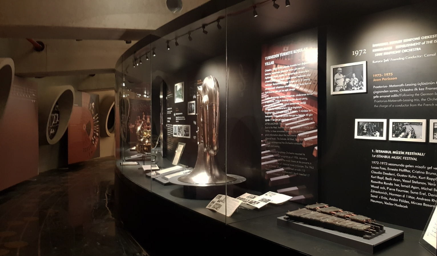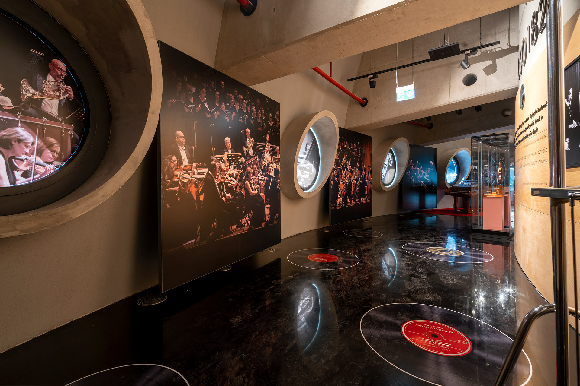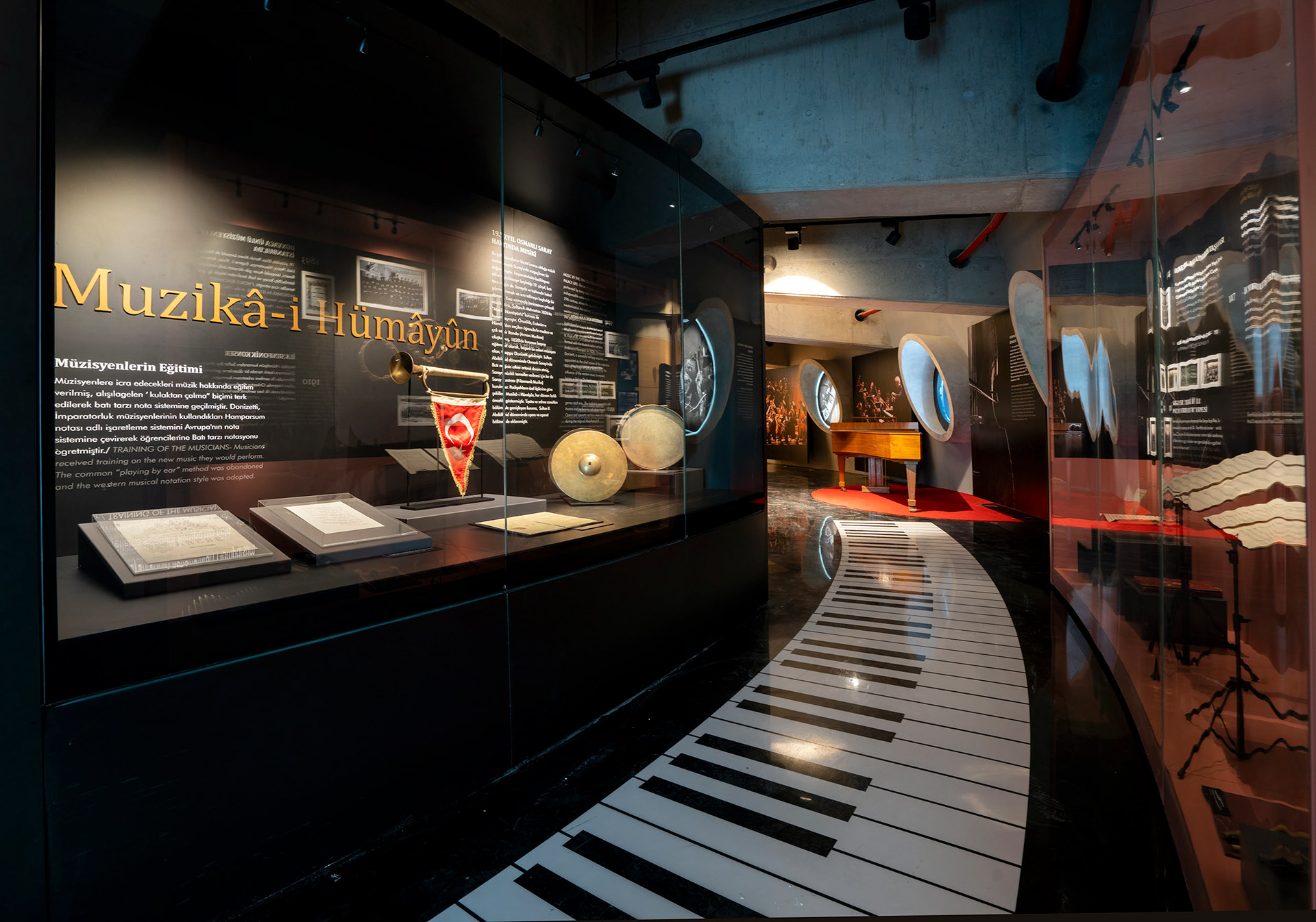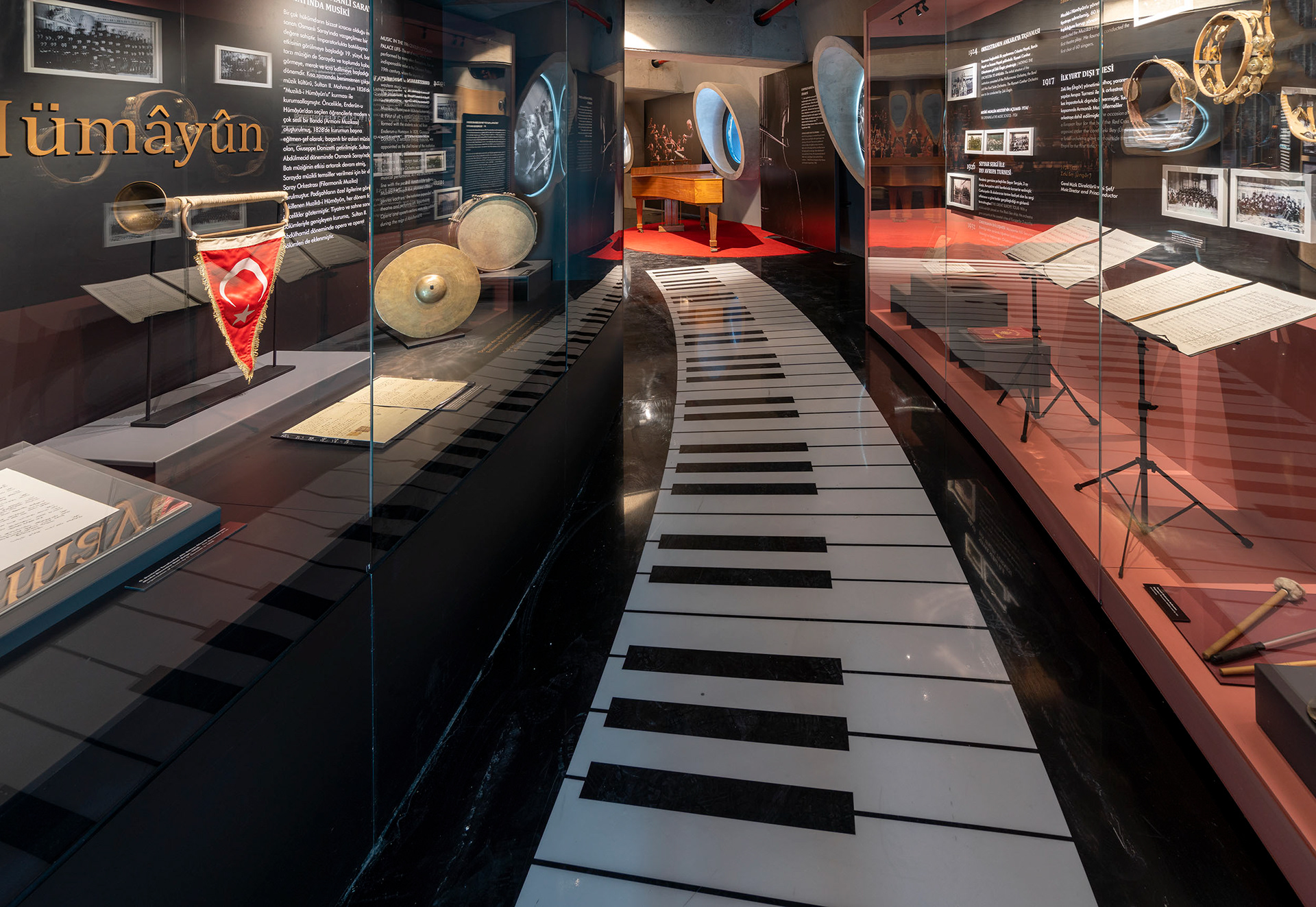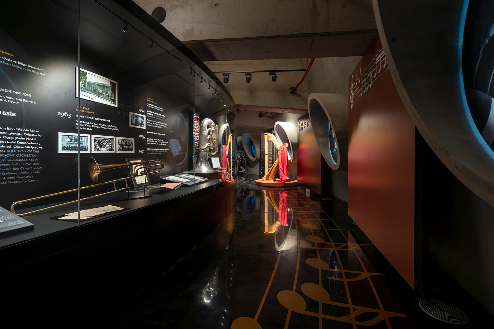 CSO1826 Cumhurbaşkanlığı Senfoni Orkestrası Müzesi// The Presidential Symphony Orchestra is one of the deepest-rooted art institutions in the world. It is among the rare collective arts institutions that have been operational throughout history. The total Site Area is 40.000 m². CSO1826 is the annex of Ankara’s new concert avenue that has 27 years history of construction. the exhibition reveals 200 years of presidential orchestrate in 360m2 compact space formerly planned to be a “CD shop”. It is situated in a relatively wide corridor/ hole surrounding the chamber orchestra venue. The two continuous circular walls defining the exhibition space shapes the general characteristics of the interior design. Walkthrough the exhibition and the experience differentiate by sound, material choice, light plays and graphic design. Using bold moments of material choice, color and fine woven details we transform the repetition to surprise and depth. It was a minuscule space which is waved with bold statements. TEATI was responsible for the concept design, collection management and museum scenario narration including shop-drawings and fabrication, museum lighting design. We also held the construction consultancy and the proper material choice and implementation of the details for the Ministry of Culture.